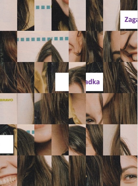 Zadanie polega na tym, aby spróbować ułożyć sobie z tych skrawków (w wyobraźni) cały pocięty plakat i napisać, kto na nim jest.